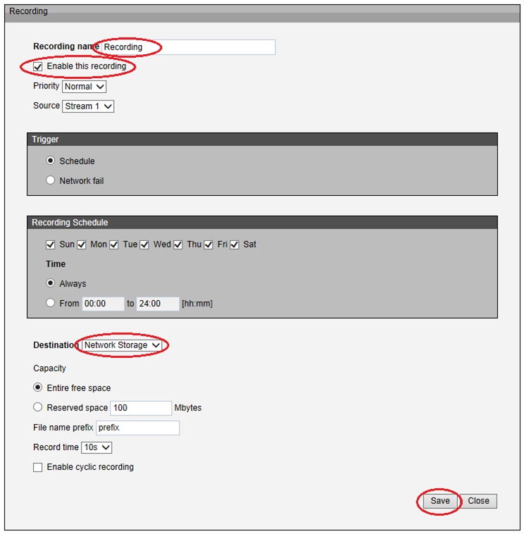 Recording schedule – расписание записи. Здесь необходимо отметить дни недели и задать временной диапазон для ведения записи.