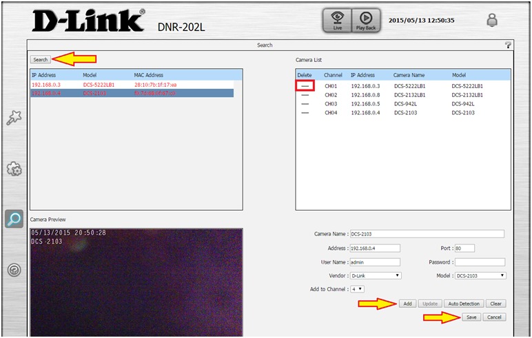 Нажмите кнопку Add (Добавить), после чего камера появится в окне Camera List (Список камер). Для сохранения текущих настроек нажмите Save (Сохранить).