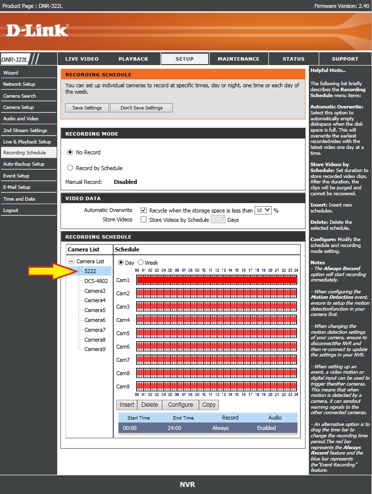 Вопрос: Как настроить постоянную запись на сетевом видеорегистраторе DNR-322L?