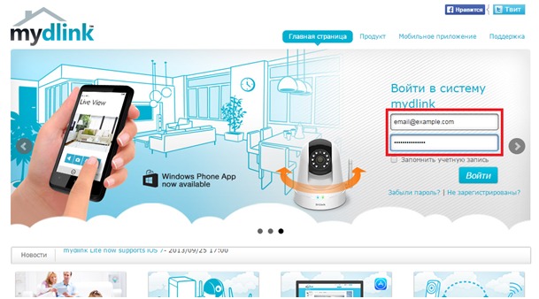 Шаг 2: Введите Ваши учетные данные mydlink (адрес email и пароль) в окне авторизации и нажмите Войти