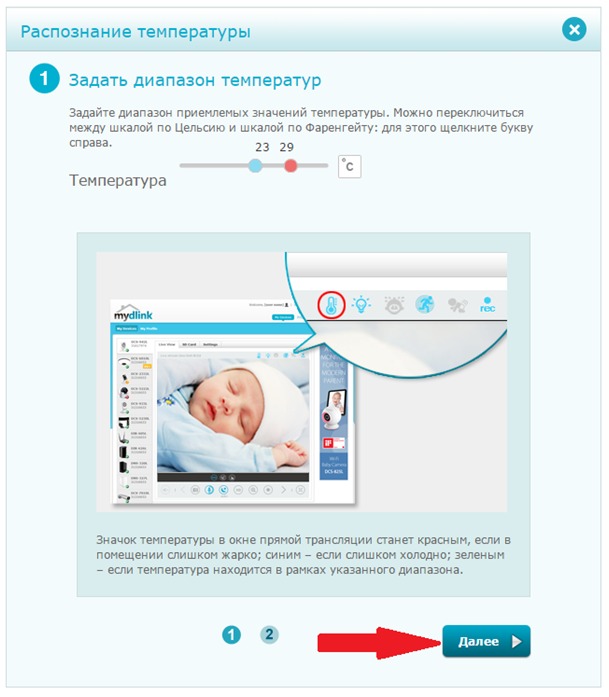 Шаг 5: Нажмите на ползунки и перетащите их, чтобы задать диапазон приемлемых температур. Вы можете выбрать шкалу Цельсия или Фаренгейта, нажав на символ градуса справа. Нажмите Далее, чтобы продолжить.