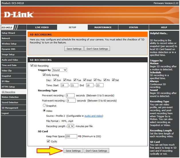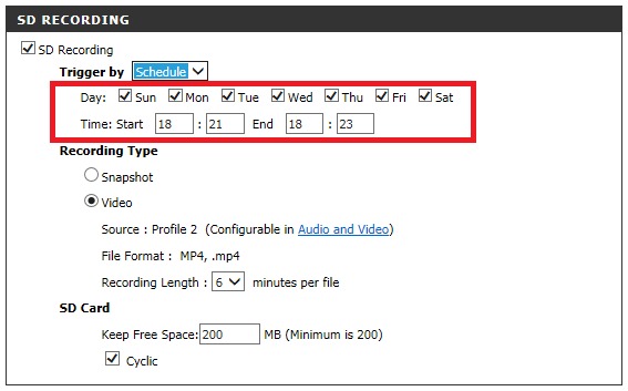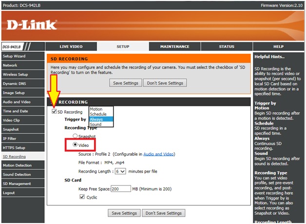 Шаг 7: Установите флажок SD Recording (Запись на SD-карту) для того, чтобы включить запись на microSD-карту. Для записи видео установите переключатель в положение Video, а для создания снимков – в положение Snapshot.