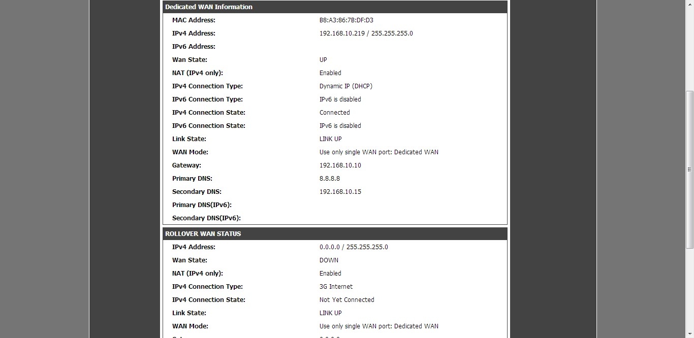 В обычном режиме работы оба WAN находятся в состоянии LINK UP. При этом основное WAN соединение имеет статус UP, а резервное - DOWN. То есть физически доступны оба канала, но сейчас доступ в Интернет обеспечивается через Ethernet соединение.