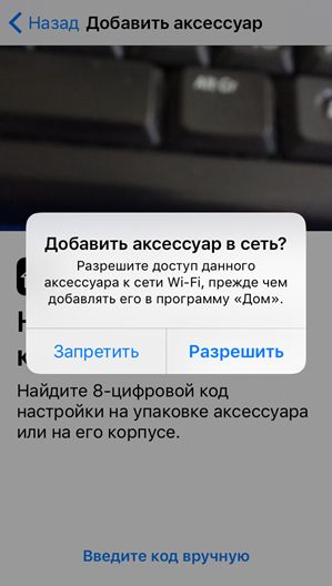 - Далее появится сообщение с запросом на разрешение подключения аксессуара к домашней Wi-Fi-сети. Выберите «Разрешить».