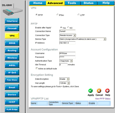 VPN-сервер DSL-G804V позволяет устанавливать PPTP-соединения с использованием как PAP, так и CHAP аутентификации.