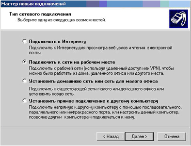 - Нажмите “Далее” и выберите "Подключить к сети на рабочем месте". Нажмите “Далее”.
