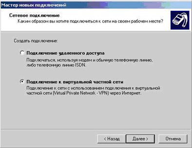 - Выберите "Подключение к виртуальной частной сети" и нажмите “Далее”.