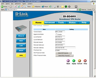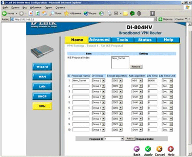 Аналогичным образом настраиваем второй DI-804HV. Настройки "IKE Proposal" и "IPSEC Proposal" у двух маршрутизаторов должны быть совершенно идентичны. Настройки VPN-туннеля у второго маршрутизатора немного отличаются: