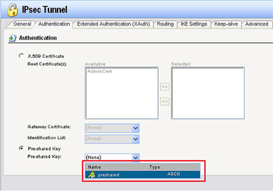 Шаг 6: Зайдите во вкладку Authentication и выберите preshared (созданный в шаге 3) из выпадающего меню опции Pre-Shared Key.