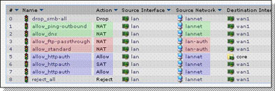 Сначала идут два правила, выделенные зеленым цветом. Эти два правила позволят прохождение пингов и DNS для всех пользователей. Затем идут два правила, отмеченных красным цветом, которые позволят только аутентифицированным пользователям воспользоваться FTP-сервисом (с помощью FTP ALG) и всем другим UDP и на основе TCP службам. Наконец далее идут три правила, отмеченных голубым цветом. Первое из них позволит пользователям выйти напрямую к аутентификации межсетевого экрана. Два других будут перенаправлять неаутентифицированных HTTP пользователей на межсетевой экран для аутентификации.
