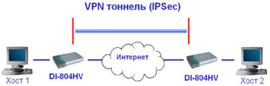 Тестирование проводилось согласно приведенной ниже схеме: между двумя шлюзами DI-804HV было организовано соединение IPSec. WAN интерфейсы шлюзов были соединены между собой кроссовым кабелем. К интерфейсам LAN каждого шлюза подключен ПК.