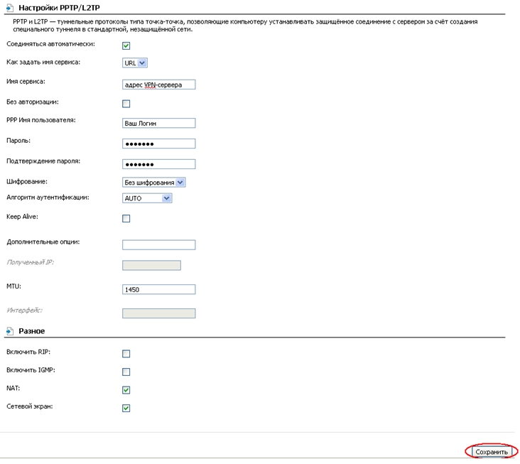 Шифрование – если у провайдера не используется MPPE-шифрование оставьте «Без шифрования». Если шифрование используется, установите MPPE AUTOили уточните тип шифрования у провайдера.