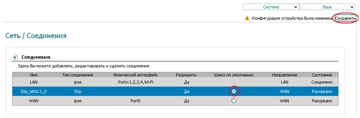 В строке с созданным соединением поставьте точку «Шлюз по умолчанию» и нажмите «Сохранить» в правом верхнем углу.
