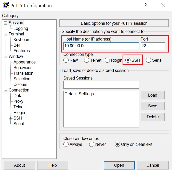 3. На экране появится панель входа приложения Putty. В строке Connection type выберите SSH, в строке Host Name (or IP address) введите 90.90.90, в поле Port —22. Нажмите кнопку Open.