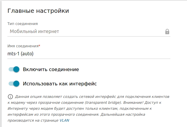6. В графе Главные настройки необходимо включить опцию Использовать как интерфейс и сохранить настройки, нажав кнопку Применить.
