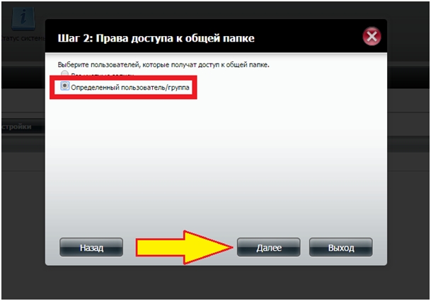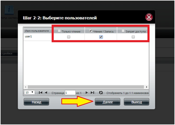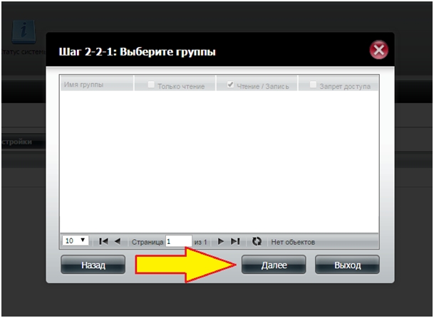 Шаг 11: Настройте правило сетевого доступа к этой папке для каждой группы пользователей. Если не было создано ни одной группы, то сразу нажмите кнопку Далее.