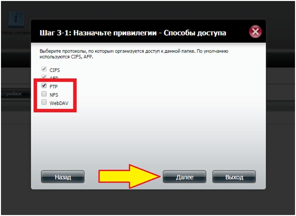 Шаг 13: Выберите сетевые протоколы для доступа к этой папке и затем нажмите кнопку Далее.