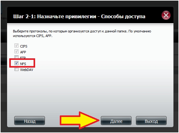 Шаг 14: Выберите протокол NFS для доступа к этой папке и затем нажмите кнопку Далее.