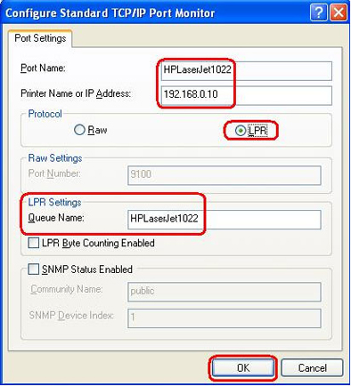 В блоке "Protocol" поставьте выделение на "LPR",в графе "Queue Name" должно быть прописано ранее запомненное значение (пункт 9) .
