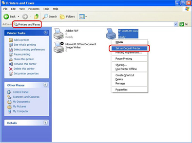 Зайдите в "Printers and Faxes", кликните правой кнопкой мыши на принтер HP LaserJet 1020/1022, и выберите в появившемся меню "Set as Default Printer".
