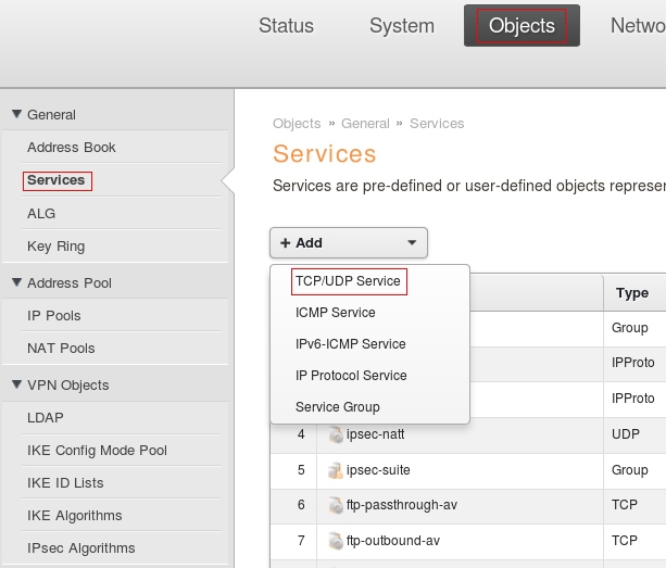 Пройдите в веб интерфейсе Objects → Services, нажмите кнопку add, из выпадающего меню выберите TCP/UDP Service (Рис 4.)