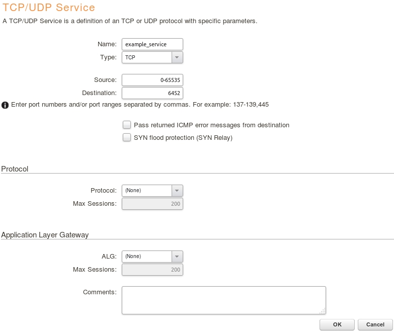 В поле Name укажите название сервиса (примере example_service), из выпадающего меню Type выберите TCP, в поле Destination укажите необходимый порт (примере 6452). нажмите кнопку ОК. Пример заполненных форм вы можете увидеть на рисунке 5.
