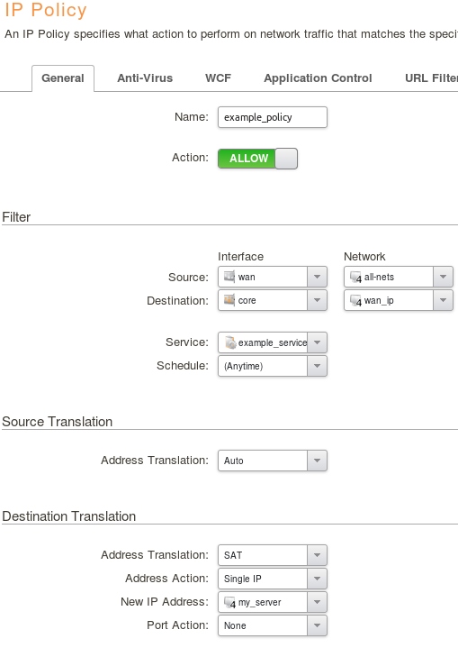 add IPPolicy Name=example_policy SourceInterface=wan SourceNetwork=all-nets DestinationInterface=core DestinationNetwork=InterfaceAddresses/wan_ip Service=example_service DestAddressTranslation=SAT DestAddressAction=SingleIP DestNewIP=my_server Action=Allow