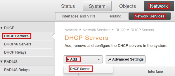 Пройдите в Web интерфейсе Network → Network Services → DHCP Servers, нажмите кнопку Add, из выпадающего меню выберите DHCP Server.