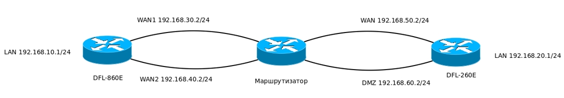 Основной VPN IPsec будет устанавливаться между WAN1 DFL-860E и WAN DFL-260E, резервный тоннель будет установлен между WAN2 DFL-860E и DMZ DFL-260E.