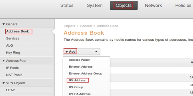 Пройдите в WEB интерфейсе Objects → Address Book, нажмите кнопку Add, из выпадающего меню выберите IP4 Address.