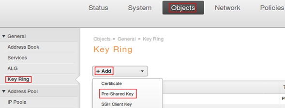 Пройдите в Web интерфейсе Objects → Key Ring, нажмите кнопку Add, из выпадающего меню выберите Pre-Shared Key.