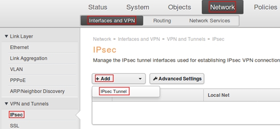 Пройдите Network → Interfaces and VPN→ VPN and tunnels → IPSec, нажмите кнопку add выберите IPSec tunnel.