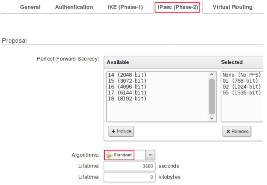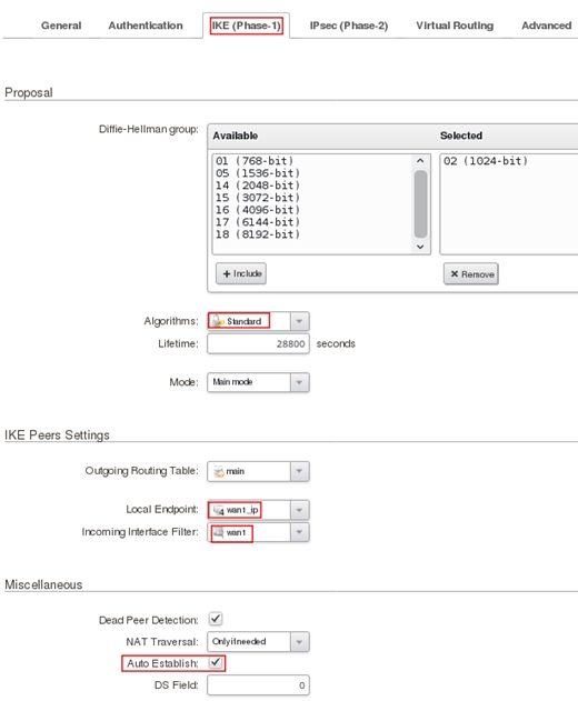 add Interface IPsecTunnel tun1 PSK=key1 LocalNetwork=InterfaceAddresses/lan_net RemoteNetwork=remote_net IPsecAlgorithms=Standard IKEAlgorithms=Standard RemoteEndpoint=remote_wan AutoEstablish=Yes AddRouteToRemoteNet=No LocalEndpoint=InterfaceAddresses/wan1_ip IncomingInterfaceFilter=wan1 AutoInterfaceNetworkRoute=No