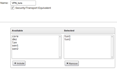 add Interface InterfaceGroup VPN_tuns Members=tun1,tun2 Equivalent=Yes