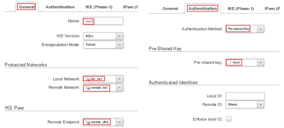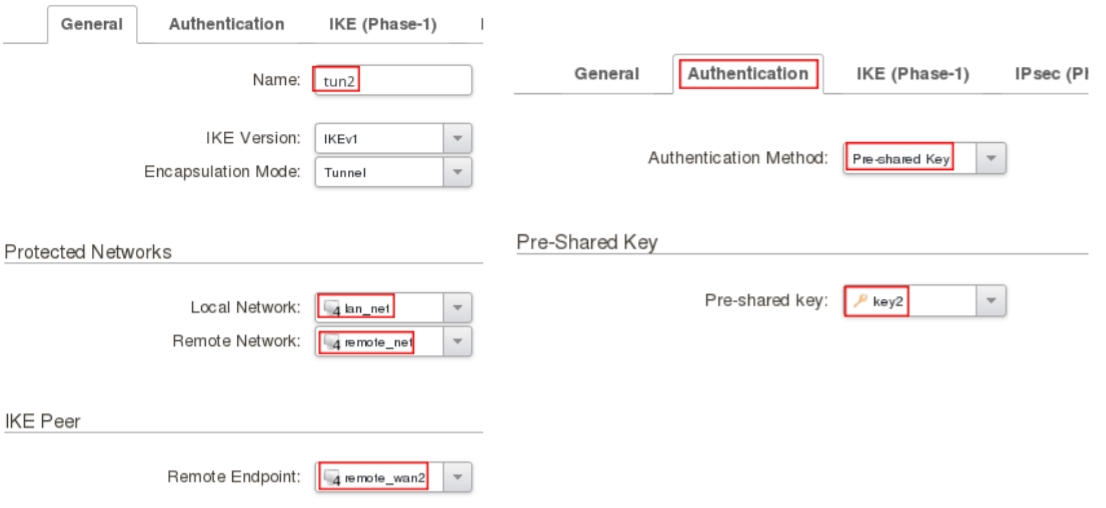 add Interface IPsecTunnel tun2 PSK=key2 LocalNetwork=InterfaceAddresses/lan_net RemoteNetwork=remote_net AutoEstablish=Yes IPsecAlgorithms=Standard IKEAlgorithms=Standard LocalEndpoint=InterfaceAddresses/wan2_ip IncomingInterfaceFilter=wan2 RemoteEndpoint=remote_dmz