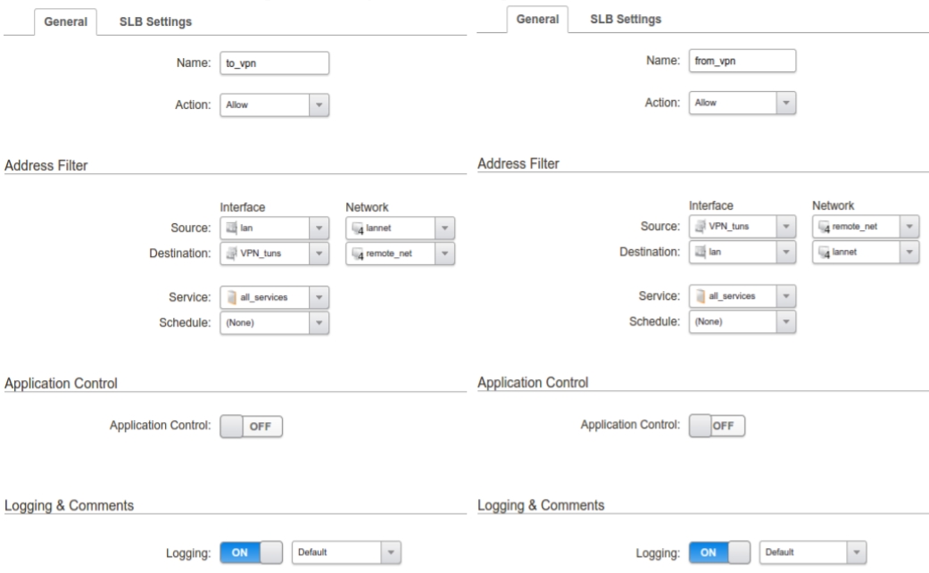 add IPRule Action=Allow SourceInterface=lan SourceNetwork=InterfaceAddresses/lannet DestinationInterface=VPN_tuns DestinationNetwork=remote_net Service=all_services Name=to_vpn