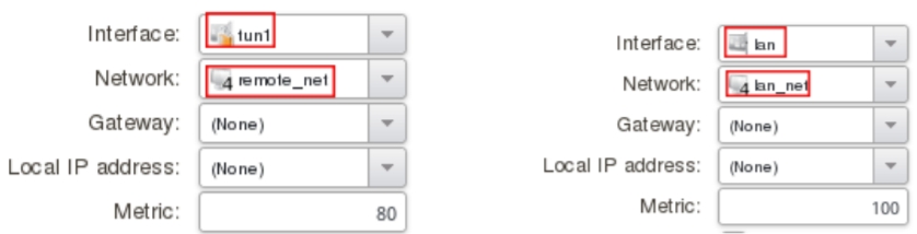 Пройдите Network → Routing → Routing tables → main и нажмите кнопку add и выберите Route IPv4. Настройки 2х маршрутов приведены на скриншотах ниже.