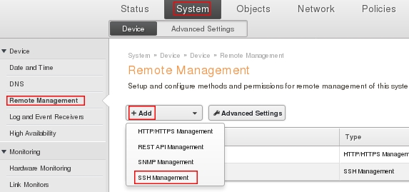 Пройдите в web интерфейсе System → Remote Management, нажмите кнопку Add и из выпадающего меню выберите SSH Management.