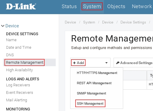 Пройдите в web интерфейсе System → Remote Management, нажмите кнопку Add и из выпадающего меню выберите SSH Management.