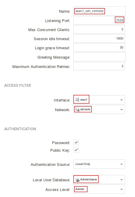 При открытии удаленного управления по ssh следует учитывать, что в отличии от управления по http/https в правиле ssh нельзя использовать интерфейс any, это не будет работать на всех интерфейса. При добавлении правила управления обязательно указывайте конкретный интерфейс и порт. Для увеличения безопасности рекомендуется использовать не стандартный порт для ssh.