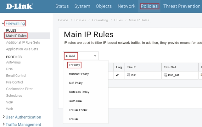 Пройдите в web интерфейсе Policies → Main IP Rules, нажмите кнопку Add и выберите IP Policy