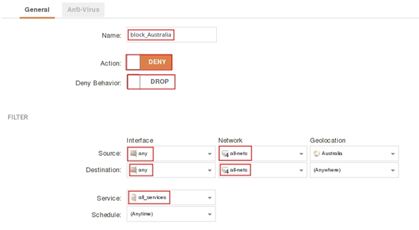 add IPPolicy SourceInterface=any SourceNetwork=all-nets DestinationInterface=any DestinationNetwork=all-nets Name=block_Australia Service=all_services Action=Deny SourceGeoFilter=Australia Index=1