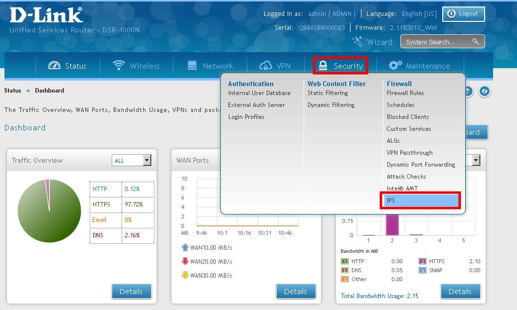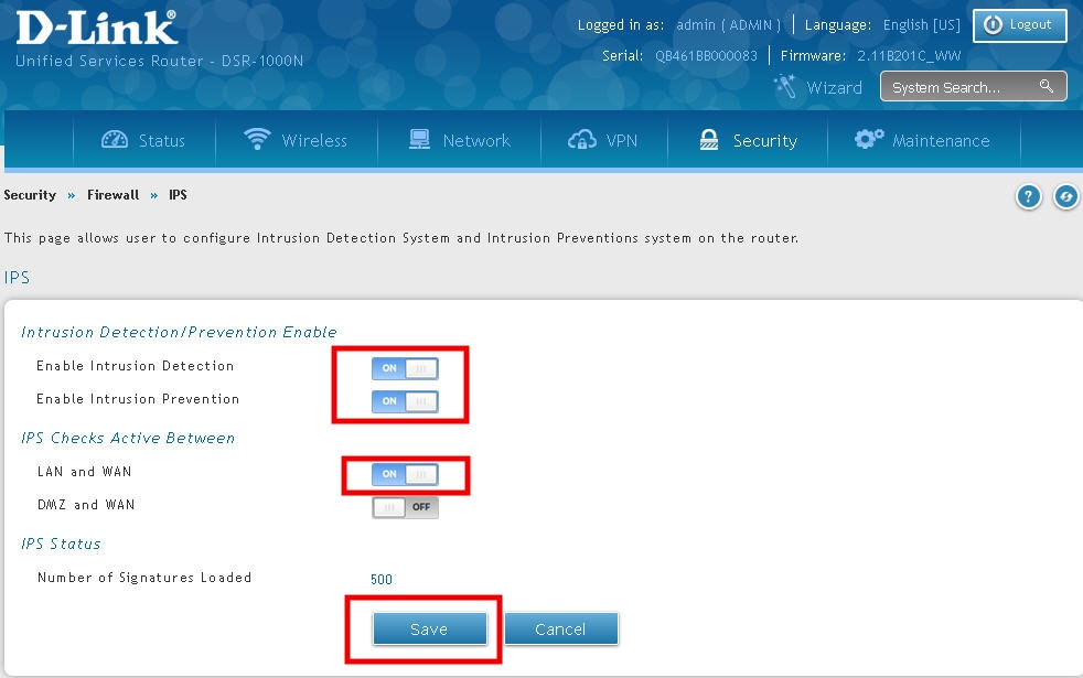 Маршрутизаторы DSR-250/250N, DSR-500/500N/500AC и DSR-1000/1000N/1000AC имеют функцию IPS (Intrusion Prevention System, Система предотвращения вторжений). Она является встроенной в прошивку и не требует приобретения каких-то дополнительных подписок или лицензий.