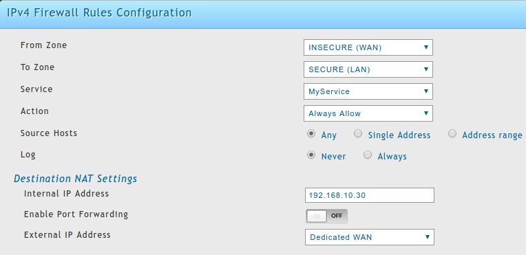 При настройки правила, обратите внимание на параметр Internal IP Address, в это поле необходимо указать IP адрес на который мы будем открывать порт. В остальном же следуйте примеру который приведен на рисунке ниже.