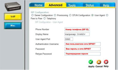 7. На той же странице выберите пункт User Agent для настройки Вашего аккаунта на сервере SIPNet и введите параметры: