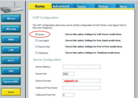 5. Откройте закладку HOME, нажмите кнопку Voice и выберите пункт Server для настроек доступа к серверу SIPNet.