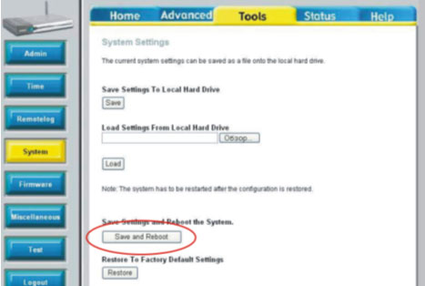 7. Для того, чтобы все настройки вступили в силу, необходимо открыть закладку TOOLS, выбрать клавишу SYSTEM и нажать кнопку Save and Reboot.