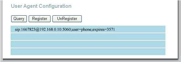 8. Для контроля регистрации VoIP шлюза на сервере SIPNET необходимо снова зайти на WEB-интерфейс шлюза (по IP-адресу, установленному Вами при настройке WAN-интерфейса), открыть закладку HOME, выбрать клавишу Voice, выбрать пункт User Agent и нажать на кнопку Query.