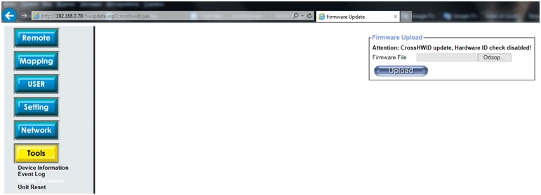 В открывшемся окне Firmware Upload нажмите кнопку Обзор и выберите необходимый файл с новой версией ПО. Далее нажмите кнопку Upload.